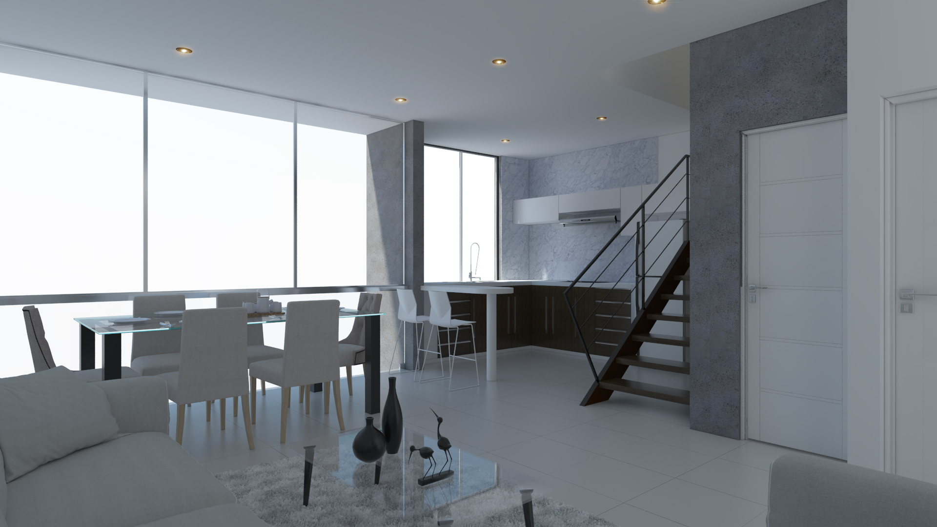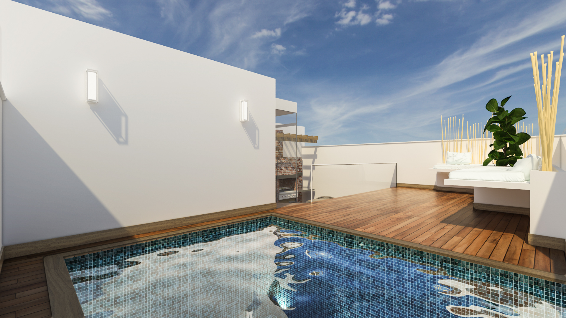 Vivienda multifamiliar, área social en el tercer nivel que incluye una piscina con vista exterior vidriada en el tercer piso.